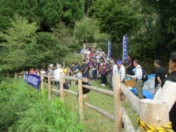 - 開始前セレモニー。「川高初雁の森」前方の木の柵は飯能市森林づくり課「森の番人」の皆さんに新調していただいた。
