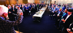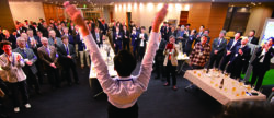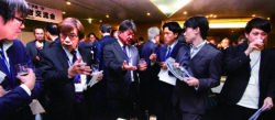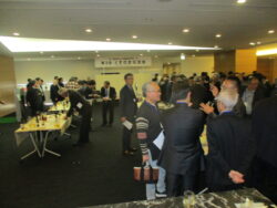 開催セレモニー後に参加者132人がホワイエに移動。会を重ねる毎に、若い年代の同窓生の参加が増えてきました。乾杯の発声後には、早速、会場のあちこちで名刺交換等をしながら先輩・後輩の枠を超えた笑顔での交流が始まりました。交流の合間には、適宜、根岸同窓会長より壇上での挨拶を依頼された同窓生が登壇。それぞれの立場から貴重な情報提供を交えた挨拶を行いました。そして、挨拶を終え降壇した発表者の周りに同窓生が集い、さらに交流が深まる場面が見られました。会の終盤には、応援部ОB諸氏の指揮で、恒例の第一応援歌、校歌の斉唱を行いました。