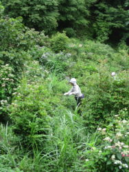 6月23日(金)、前日からの雨も未明にはあがり、下刈などの森の整備作業を行いました。参加者は「川高初雁の森」事業部会幹事と同窓生有志、飯能市森林づくり推進課の皆さんの24人。曇り空であったことも幸いし、9時45分からほぼ2時間、途中に休憩をはさみながら滞りなく作業を進めることができました。中腹にある「見晴らしウッドデッキ」から上の部分や急斜面などは、整備を委託している西川広域森林組合の皆さんにも同時期に作業をしていただいており、「川高初雁の森」は一段とすっきりしてきました。また、ここしばらく老朽化が懸念されていた、名栗湖畔から「川高初雁の森」に入るシカ柵入口扉を新調することができました。これも、多くの同窓生の皆さんからの「植樹料」の寄付によるもので、改めまして感謝いたします。